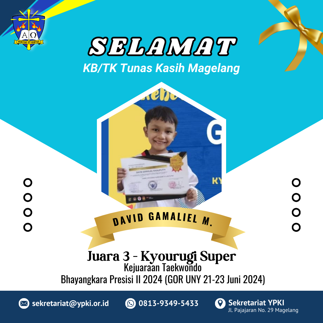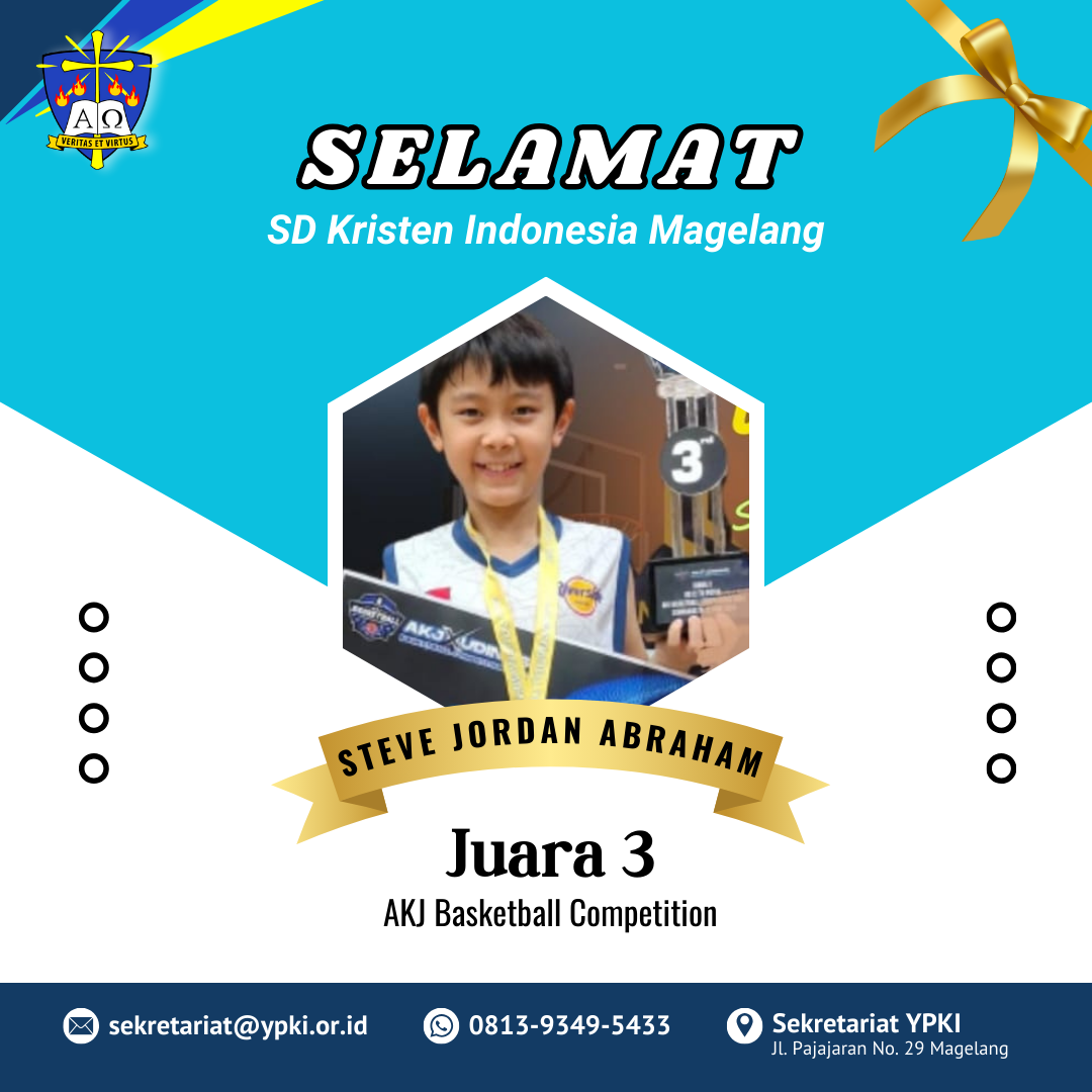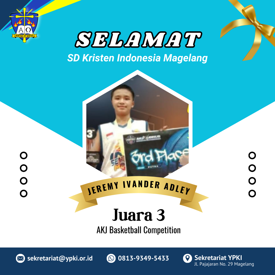 Selamat untuk David Gamaliel M. dan Hesafrilioghrisda Marcello Zefanya dari KB/TK Tunas Kasih dan SD Kristen Indonesia Magelang masing-masing meraih juara 3 dan Runner Up. Selamat juga untuk Jeremy Ivander Adley, Steve Jordan Abraham, dan Evelyn Gilbert Jhovani Gea dari SD Kristen Indonesia Magelang telah meraih Juara 3 dalam AKJ Basketball Competition. Terus berlatih dan semangat anak-anak penerus bangsa.