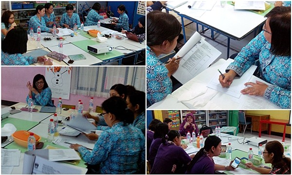 Para guru bersemangat mengikuti pelatihan yang dibawakan Ibu Nur Rahmah, S.Pd. membahas Kurikulum 2013, 7-8 Januari 2016 lalu. Dalam pelatihan dua-hari tersebut, guru-guru mempelajari Struktur Kurikulum 2013, perencanaan dan pembelajaran, scientific learning, pedoman penilaian, dan SOP kegiatan belajar-mengajar.